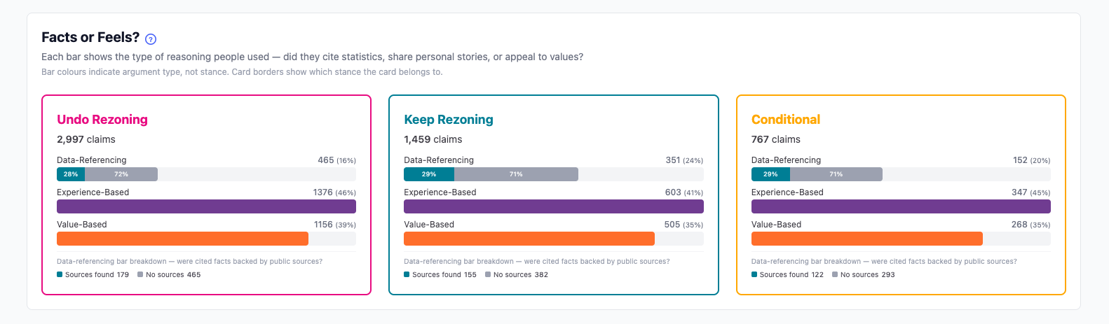 The Facts of Feels? section collects the claims per position, analyzes the type of claim, and categorizes the total claims into one of the three types to help viewers understand where the positions are coming from and how valid they deem them to be.
