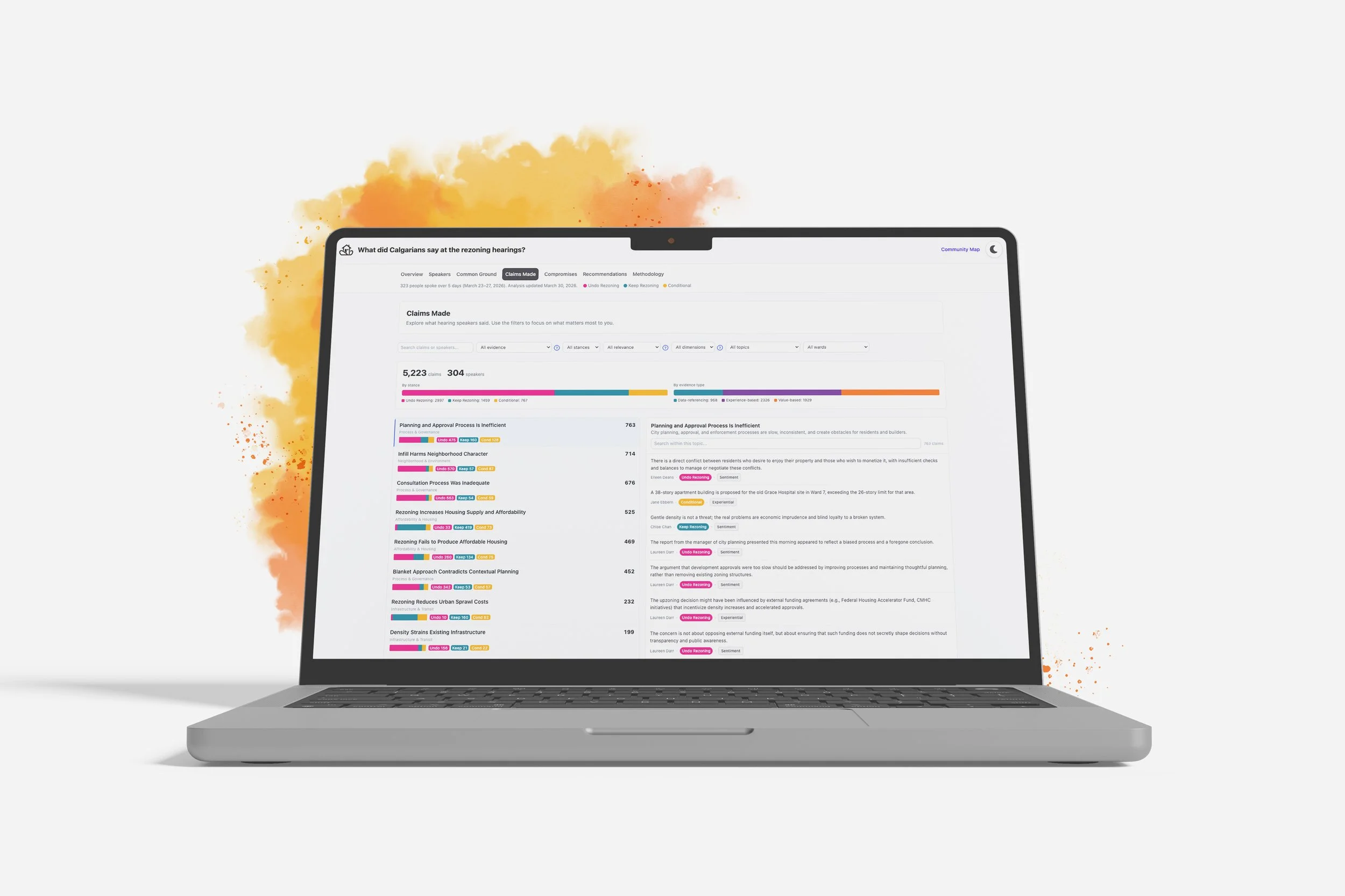The claims page organizes all the claims made by speakers for each of the repeal positions; for, against, and with conditions.