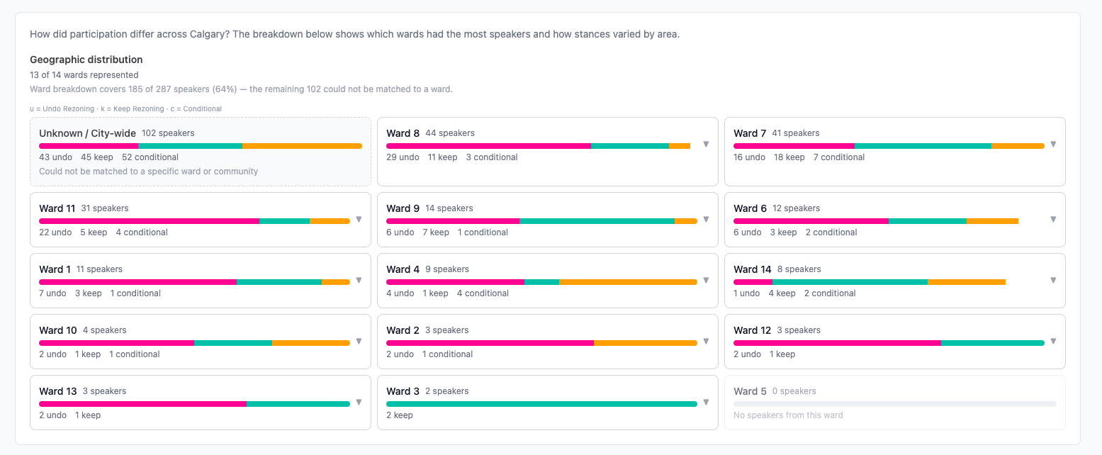 This section displays the voting stances per ward. This helps viewers understand how the various demographics across Calgary may inform their position on the zoning repeal and demonstrates how strongly some communities may weigh on a “city-wide” matter. It’s important to understand large voter-ships may only represent vocal minorities within a few communities as opposed to evenly representing Calgary as a whole.